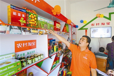 10月15日,广东恩平市大槐村,卢日能在服务站的货架上摆放着农产品。
