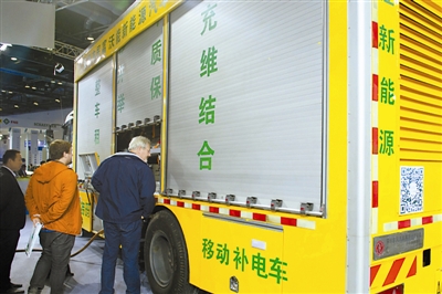 10月21日,在中国国际节能环保汽车展览会上,一款黄色的“移动补电车”亮相国家会议中心展区。该车构造近似于货车,不同之处在于车厢内全部是电池箱,蓄电总量540千瓦时,可以给普通家用纯电动车充满20多次,实际上就是一个大型的“汽车充电宝”。