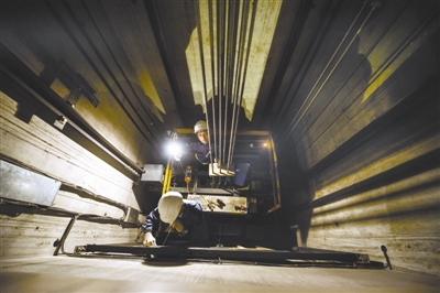 赵师傅下到电梯井内进行维修。 (本组图片由 本报记者王伟伟 摄)