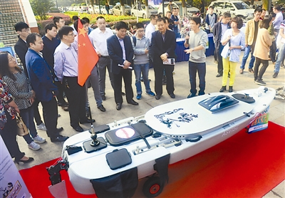 10月22日,来自合肥工业大学的学生创客团队在展示设计的水质监测自助航行器。