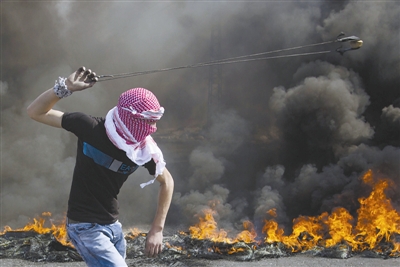 题图:当地时间10月20日,约旦河西岸,一名巴勒斯坦男子在与以色列军警的冲突中挥起投石器。 东方IC 供图