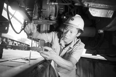 向塘机务段整备车间电力专修组是南昌铁路局“十大活力青年班组”之一,班组员工平均年龄30岁,上班时间笑声多、技能竞赛获奖多、业余时间活动多是这个班组的显著特点。图为向塘机务段整备车间电力专修组职工龙志强正在测量机车自动过分相感应装置距轨面高度。