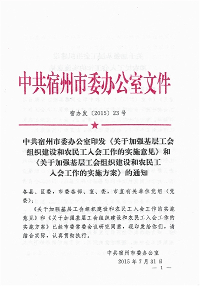 一切均以争分夺秒的速度快速推进。7月31日,那是一个周末,两份文件终于由市委办公室发出。至此,一场声势浩大的“农民工入会集中行动”在宿州市开始走向高潮。
