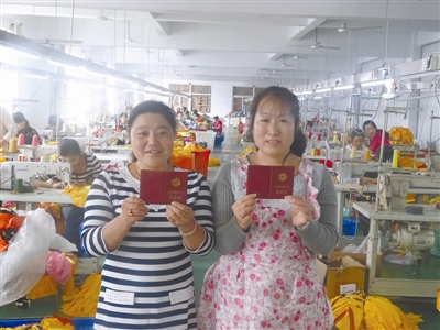 宿州凯维龙服饰有限公司员工在车间里向记者展示自己的会员证