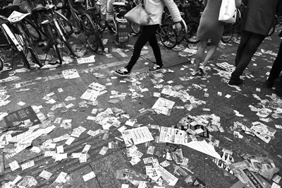 他们有的高举广告牌,有的则向过往市民疯狂散发广告小卡片和宣传单页,导致南京市区玄武门地铁站附近的中央路两侧满地垃圾。