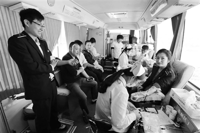10月27日,江苏省连云港市赣榆区客运总公司“爱心车队”志愿者在采血车上无偿献血。当日,该“爱心车队”的40多名志愿者进行集体献血活动。据统计,8年来该车队累计无偿献血量超过20万毫升。 思维 摄/视觉中国