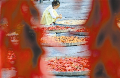 10月25日,安徽黄山,村民们在圆圆的晒匾里晒出红辣椒、玉米、黄豆、稻谷、荞麦、红豆等五彩缤纷的丰收果实,形成特有的徽派民俗景观,美不胜收,令人叹为观止。徽州呈坎古村已成为众多游人心目中的“世外桃源”。