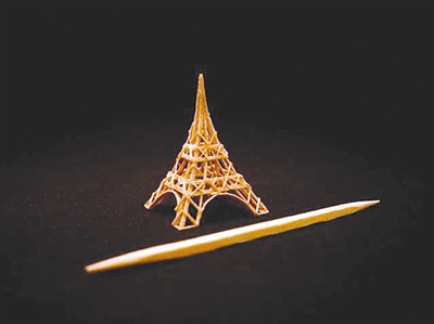 据外媒27日报道,纽约男子斯蒂芬·贝克曼是世界著名的牙签雕刻艺术家、吉尼斯纪录拥有者,他用牙签和胶水创作出了一系列世界著名地标建筑,包括帝国大厦和伦敦塔桥等。这些精美的雕刻在胶水的粘合下形成了一个个极其吸引眼球的艺术作品。图为用牙签雕成的埃菲尔铁塔。 东方IC供图