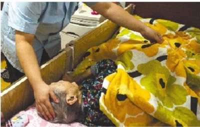 有的老人由于生活不能自理,需要完全护理。图为护工正为一名患病在床、身体不能挪动的老人喂饭。