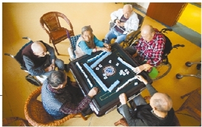 一些老人行动不便,养老院为他们提供各种娱乐项目。图为10月13日下午,6位年龄累计超过500岁的“雀友”在打麻将。