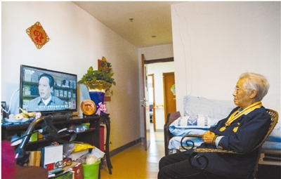 梁溪老人,91岁,身体健康。老人年轻时在延安参加革命,成为一名文职干部,解放后进入国家机关工作。为方便照顾老人,女儿将她从疗养所接到了离家较近的养老院。9月3日,梁溪老人受邀参加了“9·3大阅兵”,成为抗战老同志乘车方队的一员。老人平时最喜欢看革命题材的电视剧。图为10月13日下午,在得知将会有媒体采访后,梁溪老人戴上“纪念中国人民抗日战争胜利70周年”的纪念勋章,坐在电视机前等候。