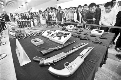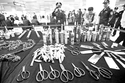10月27日,武汉地铁2号线汉口火车站站厅,安检展台上依次摆放着七大类违禁品。展出查获的违禁品仿真枪、管制刀具、一般刀具、警用军用击打器、催泪等物品种类繁多。在管制器具展台,匕首、弹簧刀等道具样式多达50余种,让围观乘客大呼“好吓人”。