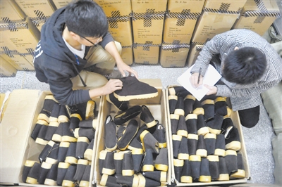 10月31日,在浙江农林大学创业孵化园内,几名大学生在自己创办的电子商务公司整理鞋类商品。随着“双十一”临近,浙江农林大学创业孵化园内的大学生电商们开始备足货源,策划促销方案,迎接购物大潮。 新华社发(胡剑欢 摄)