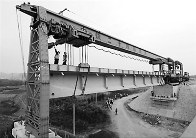 10月28日,施工人员正在九景衢铁路为跨九景高速特大桥架设第一孔32米T梁。目前,该铁路已全面进入架梁施工阶段。九景衢铁路为国家一级双线电气化铁路,线路西起江西省九江市,东至浙江省衢州市。(胡国林 王浩 摄)