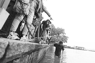 他们找到一名西湖边的环卫工人,并提出付给对方400元,让其帮忙把手机从西湖里面捞出来。环卫工人答应后,脱掉了身上的毛衣和外套,并入水帮忙打捞。据了解,杭州当天的最高气温只有17摄氏度。