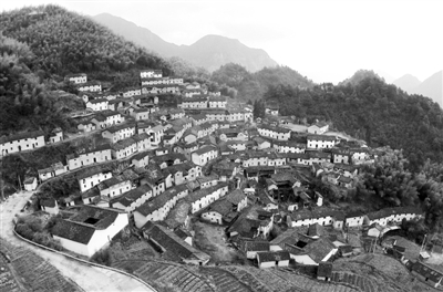 11月2日,浙江武义,空中俯瞰武义县柳城畲族镇的上黄村,100多幢泥坯房错落有致镶嵌在半山腰,其布局形状极像西藏的布达拉宫。