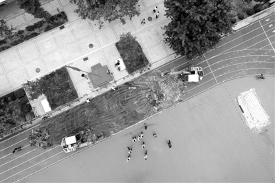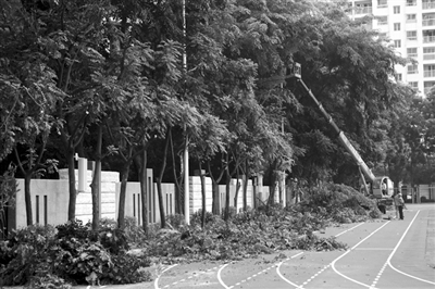 11月4日,深圳北师大南山附小。南山区政府把遮挡阳光的树木修短,让阳光暴晒跑道以“杀毒”。