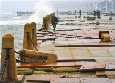 11月8日,山东省烟台市,被大浪损坏的滨海广场。