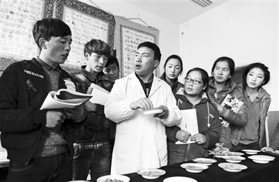 11月5日,在青海黄南藏族自治州职业技术学校,藏医学教师加羊加布(左三)为学生讲授藏药药性。