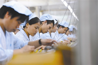 江西龙南县金塘经济技术开发区,工人们正在一家电子厂流水线上作业。赖鑫琳/视觉中国