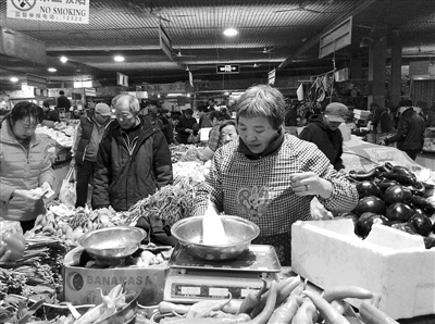 9:00,记者在北京西城区安定门西滨河路的新民菜市场见到她时,她正拿着啃了半口的烧饼一边吃着一边和顾客就一撮白菜是两块六毛四还是两块五在讨价还价。今年57岁的她,白了半边头发,上秤、算钱、拾掇摊位看起来仍然十分麻利。