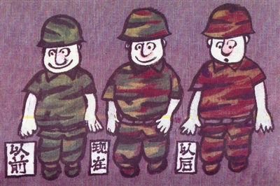迷彩服的出现,出于部队的隐蔽需要,士兵穿什么样式的迷彩服,取决于作战环境的变化。可见,漫画《迷彩服》说的是环境问题,揭示环境变化问题,过去、现在和以后,借用简单的文字,引发我们对作品进行更深一步解析: