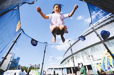 在沈阳市奥体中心体育场,人们尽情地参与蹦床、跳跃的海洋球等运动。CFP供图