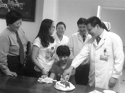 上图为北京军区总医院附属八一脑科医院的医护人员近日为男男举办的一个简朴而温馨的出院仪式,庆祝她成功战胜病魔奇迹般再获新生。医护人员还自发捐助2万余元,减轻其家庭负担。(罗建刚)