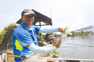 钓鱼比赛现场,选手在“秀”自己钓上来的大鱼