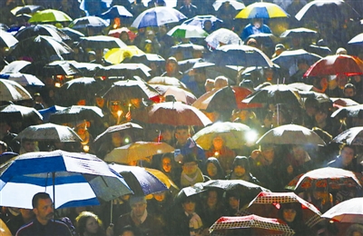 11月14日,在加拿大温哥华,人们在雨中悼念巴黎恐怖袭击事件中的遇难者。