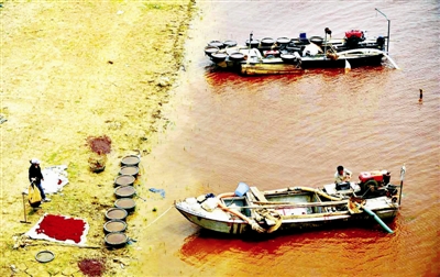 两条打捞鱼虫的船只停靠在变色的天津独流减河岸边(2014年5月25日摄)。