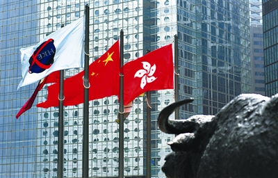 11月17日,国旗、香港特别行政区区旗和香港交易所标识旗飘扬在香港中环交易广场。