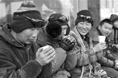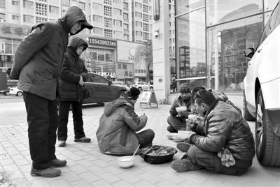 11月15日,吉林长春,一座过街天桥施工现场,工人们坐在地上吃午饭,附近店铺工作人员给他们送来热水,还有市民上前问候。