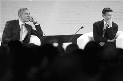 11月18日,在菲律宾首都马尼拉,美国总统奥巴马(左)与阿里巴巴集团董事局主席马云在峰会上对话。