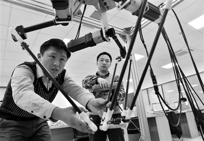 11月18日,在位于石家庄市科技创新服务中心的河北昂泰机器人科技有限公司,技术人员在研发工业用并联机器人。