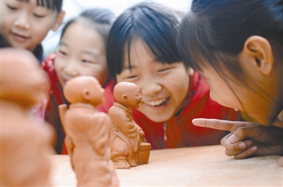 近日,由河南省文化厅等单位举办的“非遗进校园”巡展活动在郑州市黄河路一小举行,孩子们近距离地接触并动手体验淮阳泥泥狗、汴绣、香包等非遗项目,感受非物质文化遗产的独特魅力。 张涛 摄