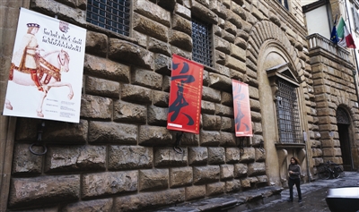 左图为美第奇宫入口处悬挂的意大利展海报。(张 雪 王 然)