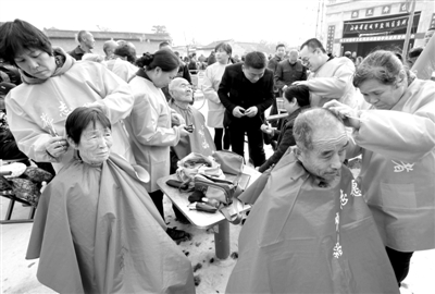 当日,山西省运城市敬老服务志愿者协会的会员来到盐湖区金井乡西王村,义务为村里的百余名老人理发。据运城敬老服务志愿者协会介绍,该协会于2009年登记注册,6年来,协会会员足迹遍布运城各地,为运城老年人提供公益服务。新华社发(卫行智 摄)
