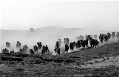 古浪县海子滩镇海子滩村的姜志基等10户农民饲养了近400峰骆驼在麻黄滩放牧,一峰骆驼可卖7000元左右,既增加了收入,又在放牧过程中起到了义务防火护林的作用。姜爱平 摄/中新社