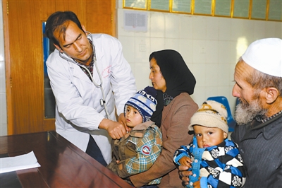 11月21日,新疆皮山县科克铁热克乡卫生院维吾尔医科医生正在为患者做治疗。新疆皮山地震发生后,各族群众积极开展灾后重建,迅速恢复生产、生活秩序。