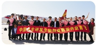 镇海炼化生产的生物航煤以餐饮废油、棕榈油为原料,应用中国石化自主研发的技术,2013年4月试飞成功;2015年3月21日,成功实现载客商业首飞。