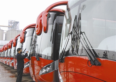 11月21日,一批国产大客车在连云港港口码头集结等待出口海外。临近岁末年底,江苏连云港港口迎来客车出口高峰。