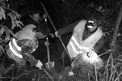 11月24日17时10分,武汉铁路局武当山桥隧车间员工雨中巡检时,发现鲍家坪桥梁与隧道之间20多米高路堑上,一块重约300多公斤的大圆石下滑10多厘米,随时可能滚落下来砸向铁路,引发事故。巡线人员迅速用绳索、撬棍固定住危石,并在圆石旁边开挖了一条长5米的侧沟,把大圆石引落到隧道顶上安全位置。本报记者 邹明强 本报通讯员 赵连斗 王军辉 摄