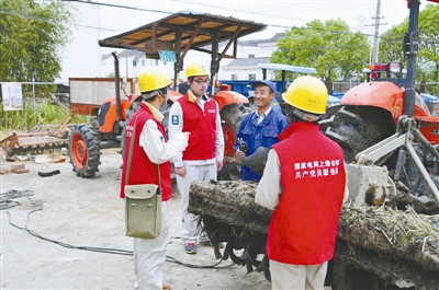 趁着阴雨间歇,国网上海电力共产党员服务队义务为家庭农场主检查农机,确保用电安全可靠