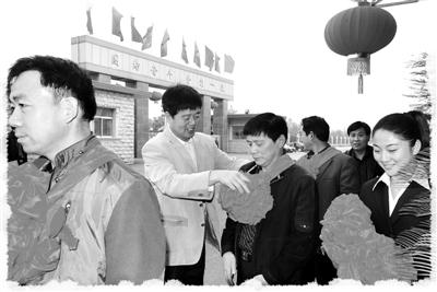 随着矿井的衰老,安徽淮北矿业集团朔石矿业公司东部井一、二水平采场濒临枯竭,赋存的三水平煤层倾角较大。采煤一区职工经过3个月的不懈努力,终于突破技术瓶颈,将3315大倾角工作面推进156.5米。图为该公司领导为延长矿井寿命的功臣戴上大红花。孟军 摄