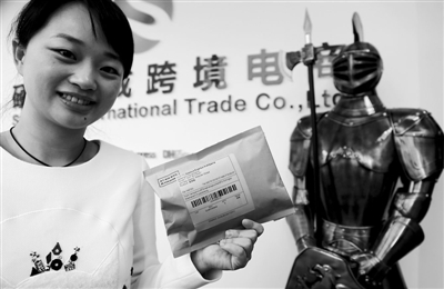 11月30日,一名工作人员在厦门邮政跨境电子商务产业园内展示即将发货的跨境包裹。