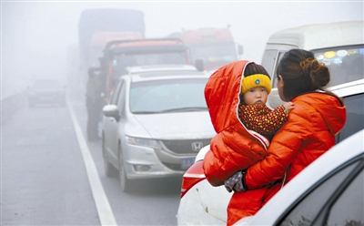 12月1日,京沪高速公路德州段遭遇堵车,前往河北的一位母亲抱着孩子在路上等候通行。
