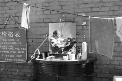 位于北京北三环边上的明光村,一名街头理发师在给顾客理发。他说:“由于城市规划需要,类似这样的街头理发将会越来越少。”