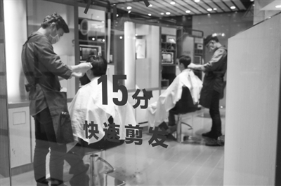 位于北京太阳宫附近的一座购物商场内,以“不烫、不染、不办卡”为经营特色的某快剪理发品牌,以低廉的价格、舒适的服务赢得不少年轻人的青睐。本报记者 王伟伟 摄