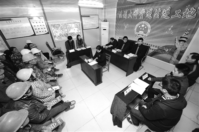 当日,在安徽合肥三里街街道凤阳路社区的组织下,辖区一处棚户区改造项目工地的农民工举办了一场“模拟法庭”。法庭的“法官”“公诉人”“被告”等角色均由农民工扮演,由当地的区人民法院进行指导,按照实际庭审程序模拟演示一起劳资纠纷案件。农民工在“模拟法庭”中收获了一堂生动的法制教育课。